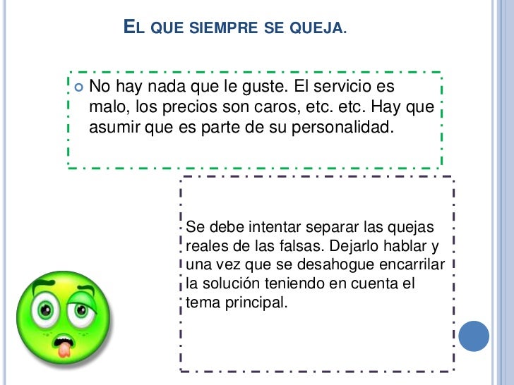 No hay que intentar cambiarlos, se debe procurar de mejorar la situación, mostrarse amable y comprensivo, tratando de colaborar y satisfacer lo que están buscando. - . El que siempre se queja.