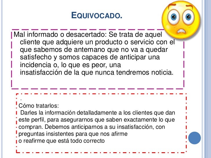 - Mal informado o desacertado: Se trata de aquel cliente que adquiere un producto o servicio con el que sabemos de antemano que no va a quedarsatisfecho y somos capaces de anticipar una incidencia o, lo que es peor, unainsatisfacción de la que nunca tendremos noticia.