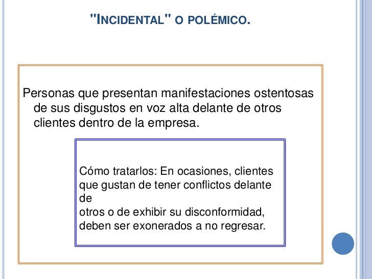 Cómo tratarlos: En ocasiones, clientes que gustan de tener conflictos delante deotros o de exhibir su disconformidad, deben ser exonerados a no regresar.